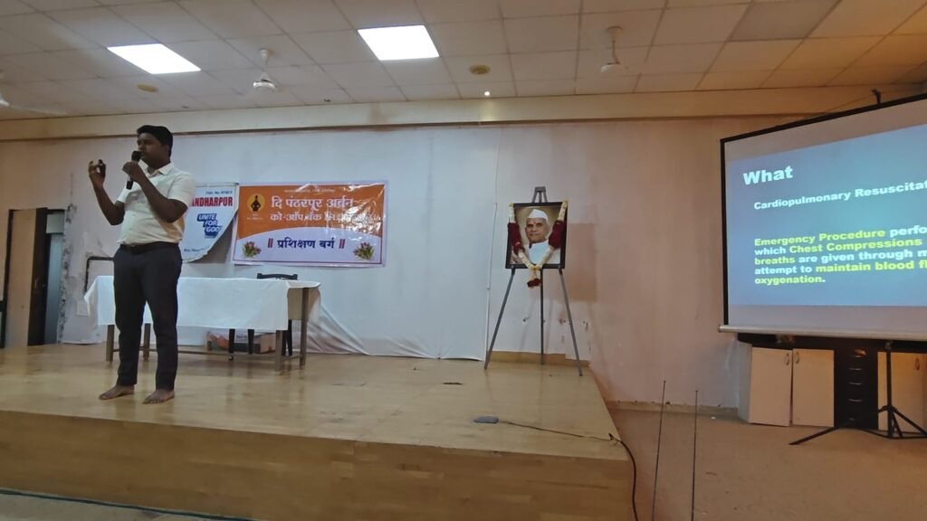 अर्थ कारणाबरोबर समाजकारणात अग्रेसर असणारी पंढरपूर अर्बन बँक कर्मचारी वर्गाला रोटरी क्लब ऑफ पंढरपूर यांचे वतीने आज बँकेचे कर्मयोगी सभागृह येथे आरोग्य जनजागृती उपक्रमांतर्गत CPR (Cardiopulmonary Resuscitation) या जीवनरक्षक तंत्रावरील देणेत आलेले मार्गदर्शन व प्रात्यक्षिक कार्यक्रम यशस्वीरीत्या पार पडला. यावेळी डॉ.नीरज दोडके व डॉ. वैभव सादिगले, तसेच बँकेचे संचालिका डॉ.संगीता पाटील यांनी हार्ट अटॅकसारख्या आपत्कालीन परिस्थितीत रुग्णाला त्वरित मदत कशी करावी याबाबत सखोल माहिती दिली.