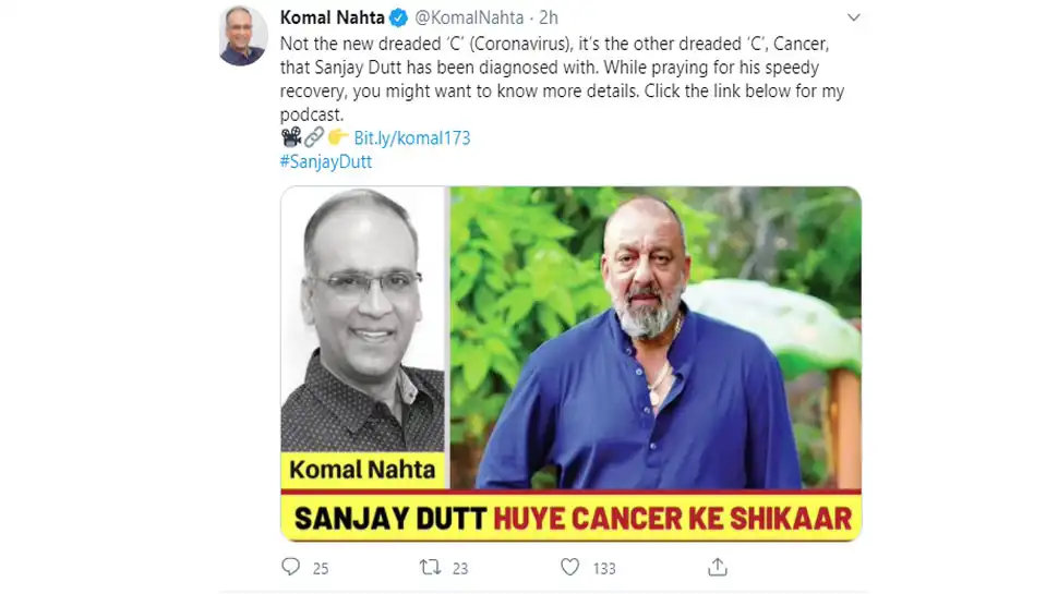काही दिवसापूर्वी संजय दत्ताला रुग्णालयात दाखल करण्यात आले होते. नाहटा यांनी ट्विटमध्ये म्हटले की, संजय दत्त याला फुफ्फुसाचा कर्करोग झाल्याचे निदान झाले आहे. त्याची प्रकृती वेगाने सुधरावी यासाठी आपण प्रार्थना करुयात.